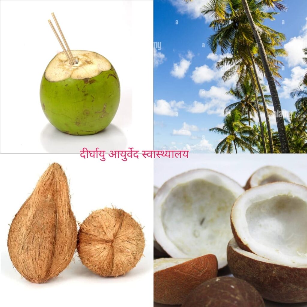 • नारळाचे पाणी हे स्निग्ध, चवीला गोड असून ते शरीरातील वात व आग कमी करते तसेच अम्लपित्त ,आतड्यांमधील व्रण, छातीतील व पोटातील जळजळ हा त्रास कमी करते.